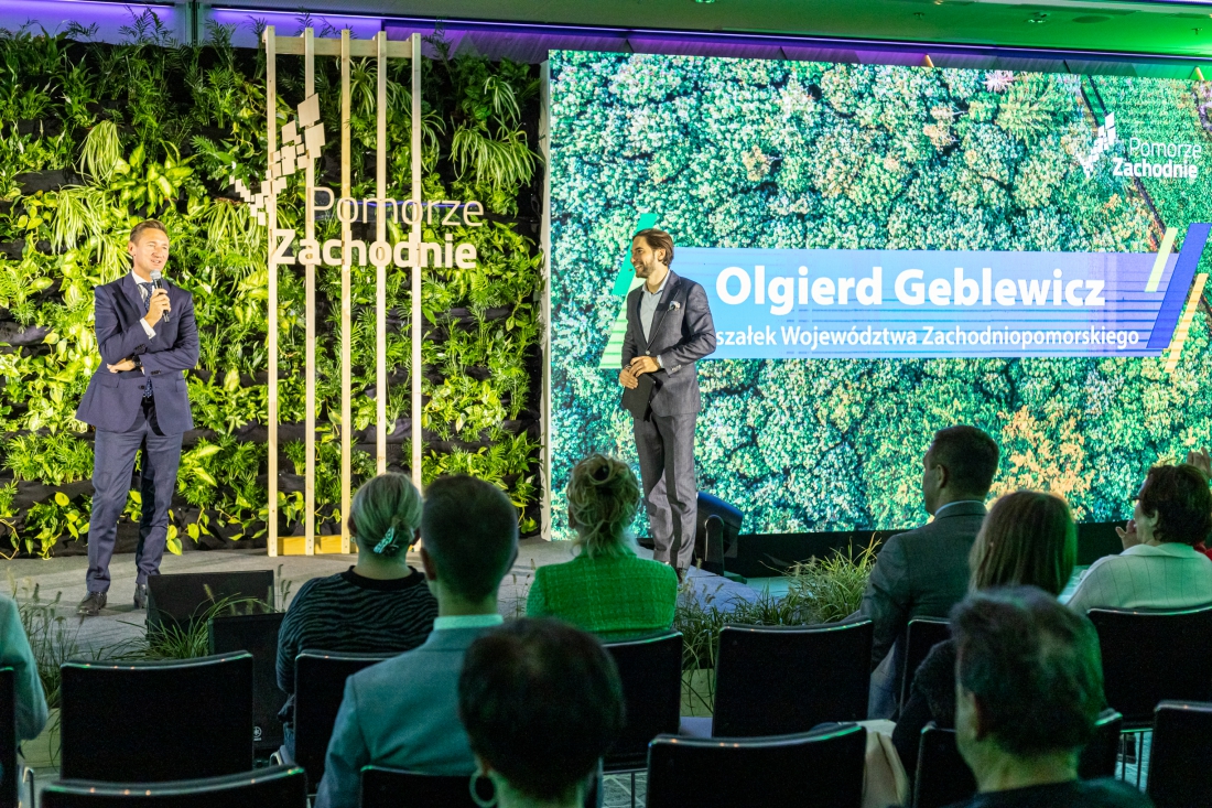 Marszałek województwa Olgierd Geblewicz w granatowym garniturze, stoi na oświetlonej scenie, z mikrofonem. Za nim ściana z roślin ozdobnych i drewniany stelaż z napisem "Pomorze Zachodnie". Obok stoi mężczyzna, a przed sceną krzesła i dziewięć osób.