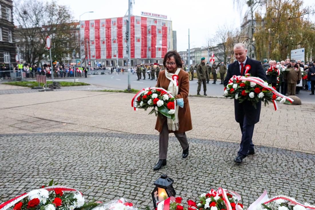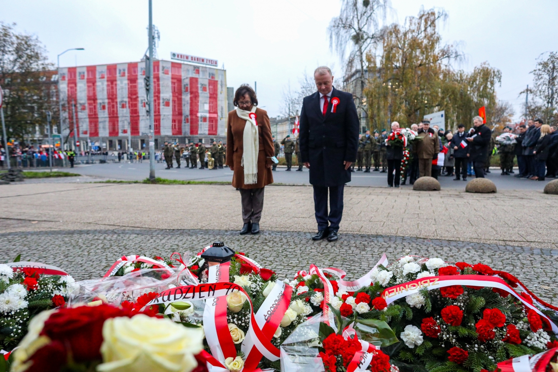 Uroczyste obchody 103. rocznicy odzyskania niepodległości przez Polskę. Wiceprzewodnicząca Sejmiku Teresa Kalina i wicemarszałek województwa Olgierd Kustosz złożyli kwiaty pod pomnikiem Marszałka Józefa Piłsudskiego.